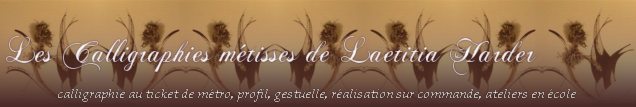 Les calligraphies métisses ont déménagé. Cliquez sur le lien pour retrouver : vente en ligne, prise de commande, réalisation sur mesure et profil au ticket de métro !!! œuvres, annonces d'expositions, cours particuliers, ateliers en école, fabrication de masques et de tout autre objets inspirés...